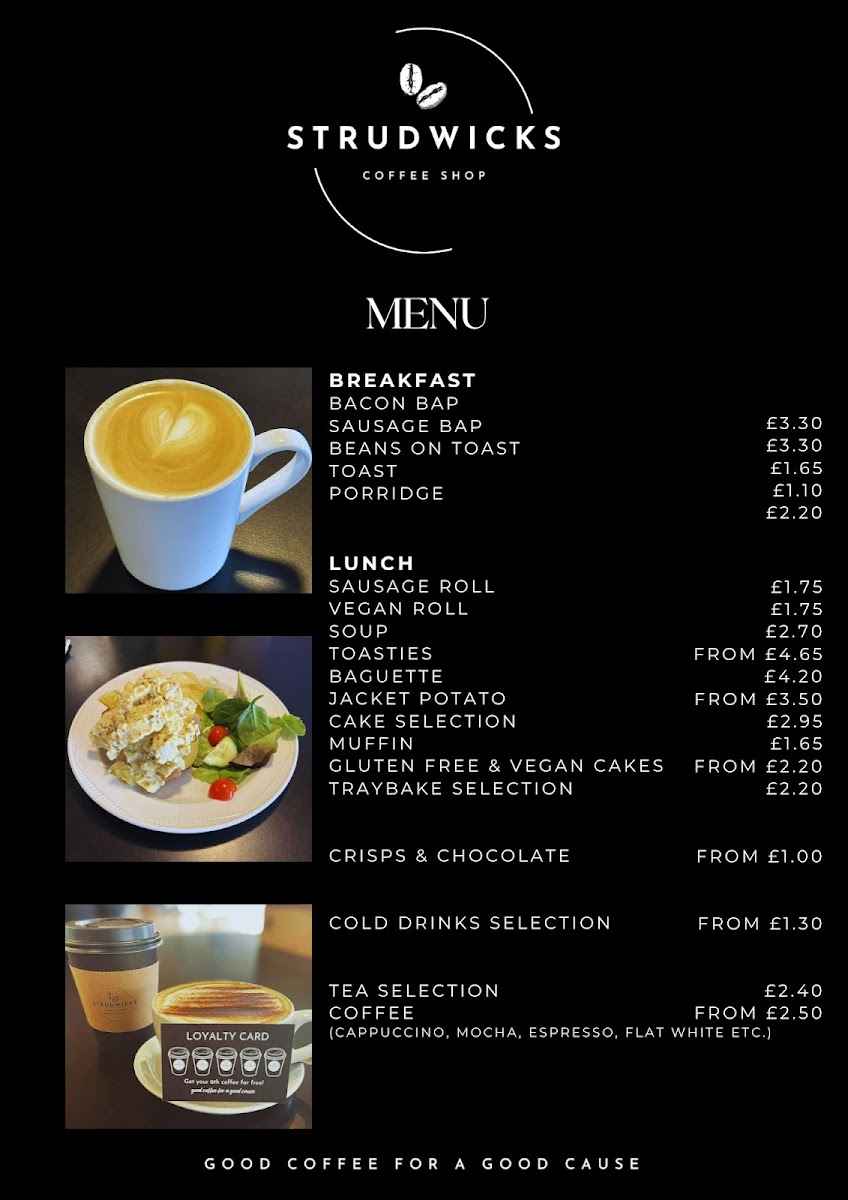 Welcome to Strudwicks, a delightful café nestled in the Christian Centre, Oldbrook, Milton Keynes. Known for its warm ambiance and friendly staff, Strudwicks strikes the perfect balance between quality and comfort. The breakfast menu features crowd-pleasers like the Bacon Bap and Sausage Bap, both priced at just £3.30, alongside lighter options like Porridge for £2.20.